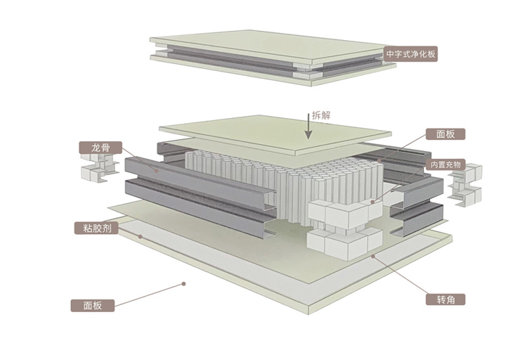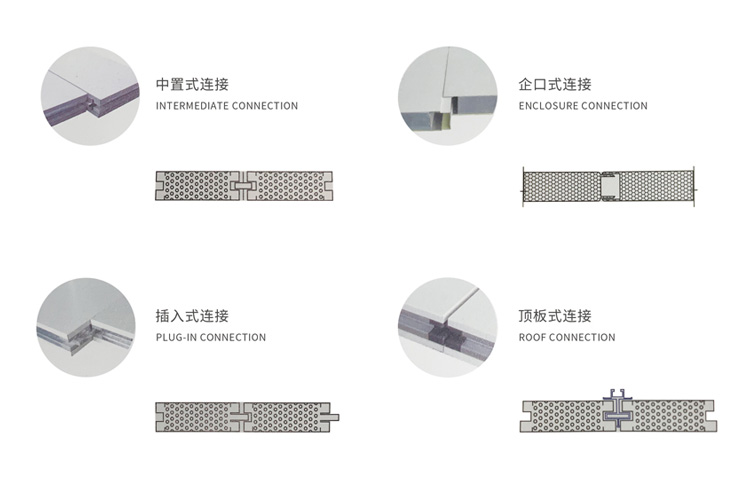 特點說明:板材四邊龍骨加強,強度更好,且避免夾芯外泄。尾板可工廠制作,現場模塊化安裝。配套模塊式成品門、窗,美觀大方。