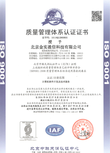 - 金實盈信ISO9001質量管理體系認證證書