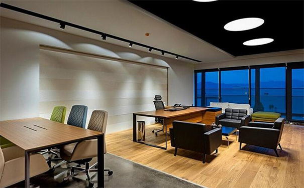 2、在燈光布置時(shí),要綜合考慮辦公室的人工照明與自然采光。在選擇照明區(qū)域方面一般應(yīng)設(shè)計(jì)在工作區(qū)兩側(cè),在位置難以確定時(shí),可選用發(fā)光面積大,亮度低的配光燈具。辦公區(qū)顯然不適合集中照明,相反會(huì)議室應(yīng)注重中心和集中感的打造,選擇辦公用具上方照明就是很好的選擇。