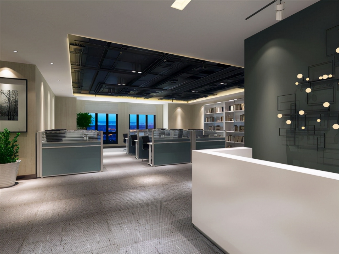 1.與自然光線合理配合。根據(jù)每個辦公室不同的朝向,在自然光弱的地方補(bǔ)充人工光線與其配合,這樣從視覺上,辦公室整體是非常亮堂的,而且不刺眼。